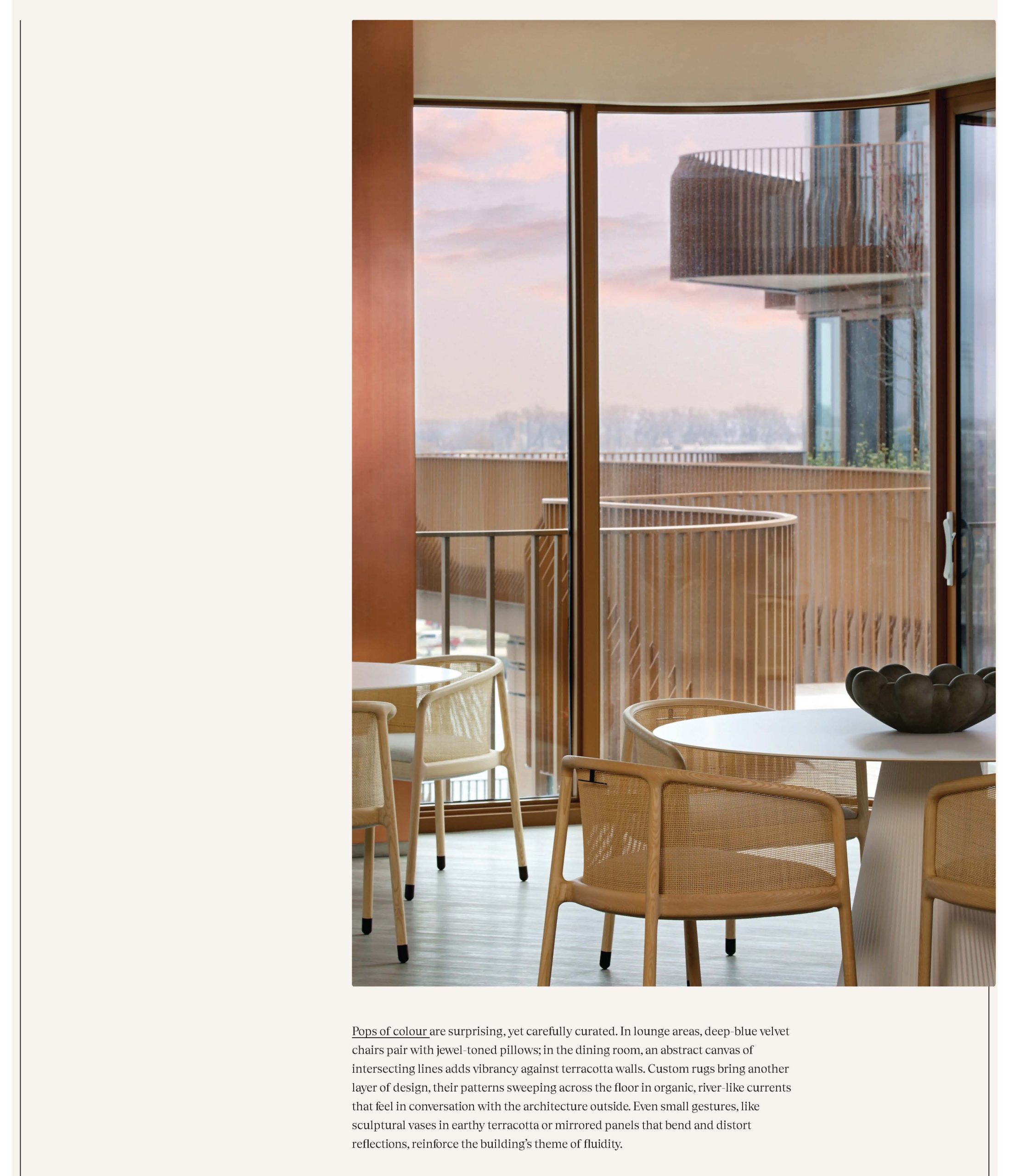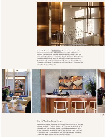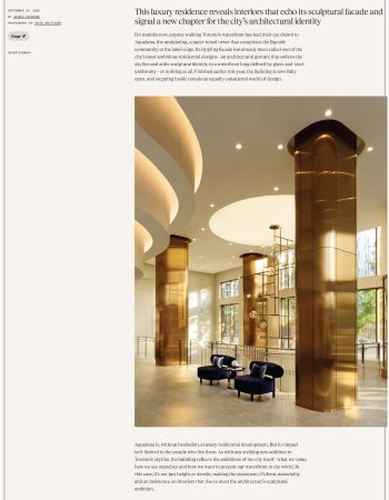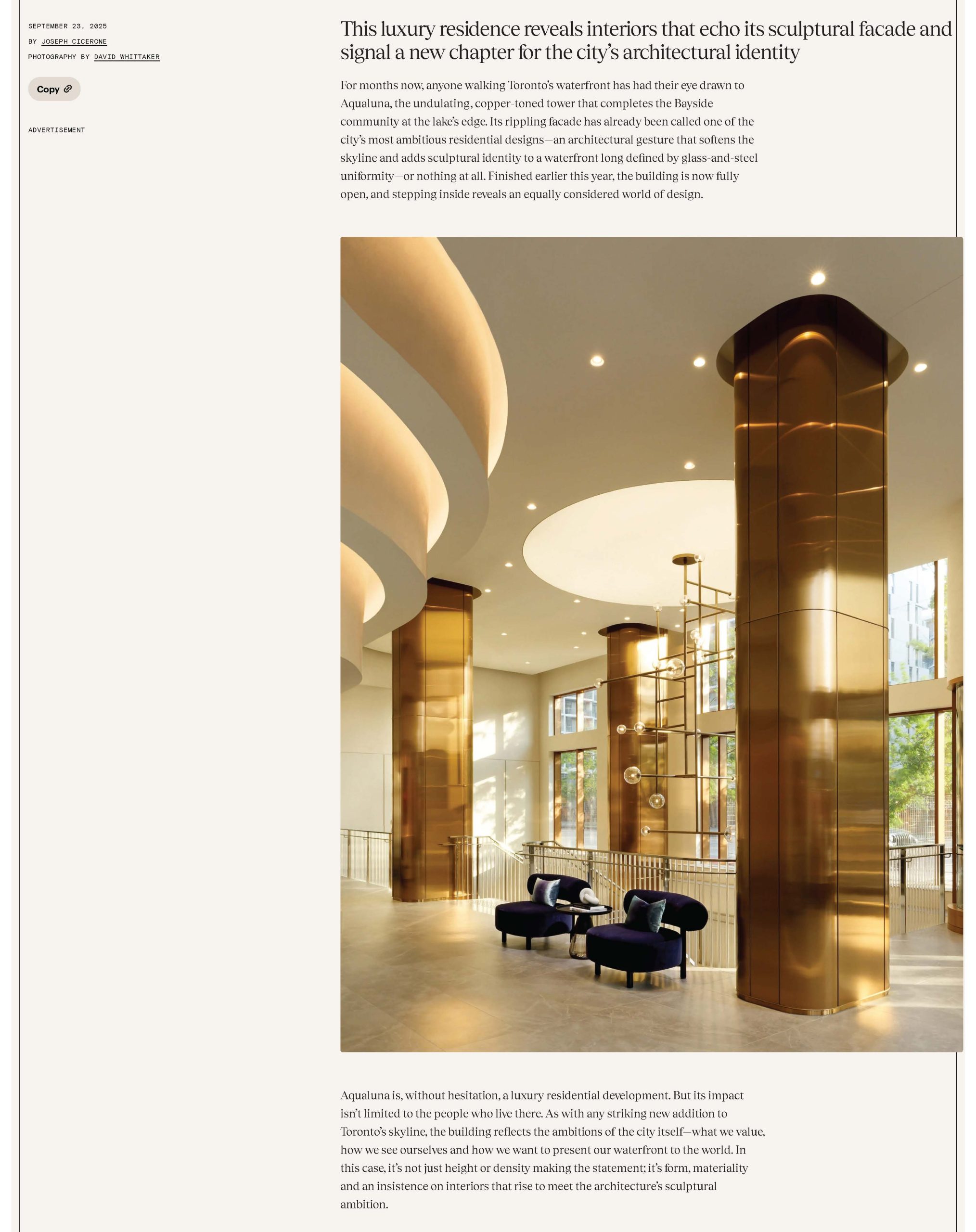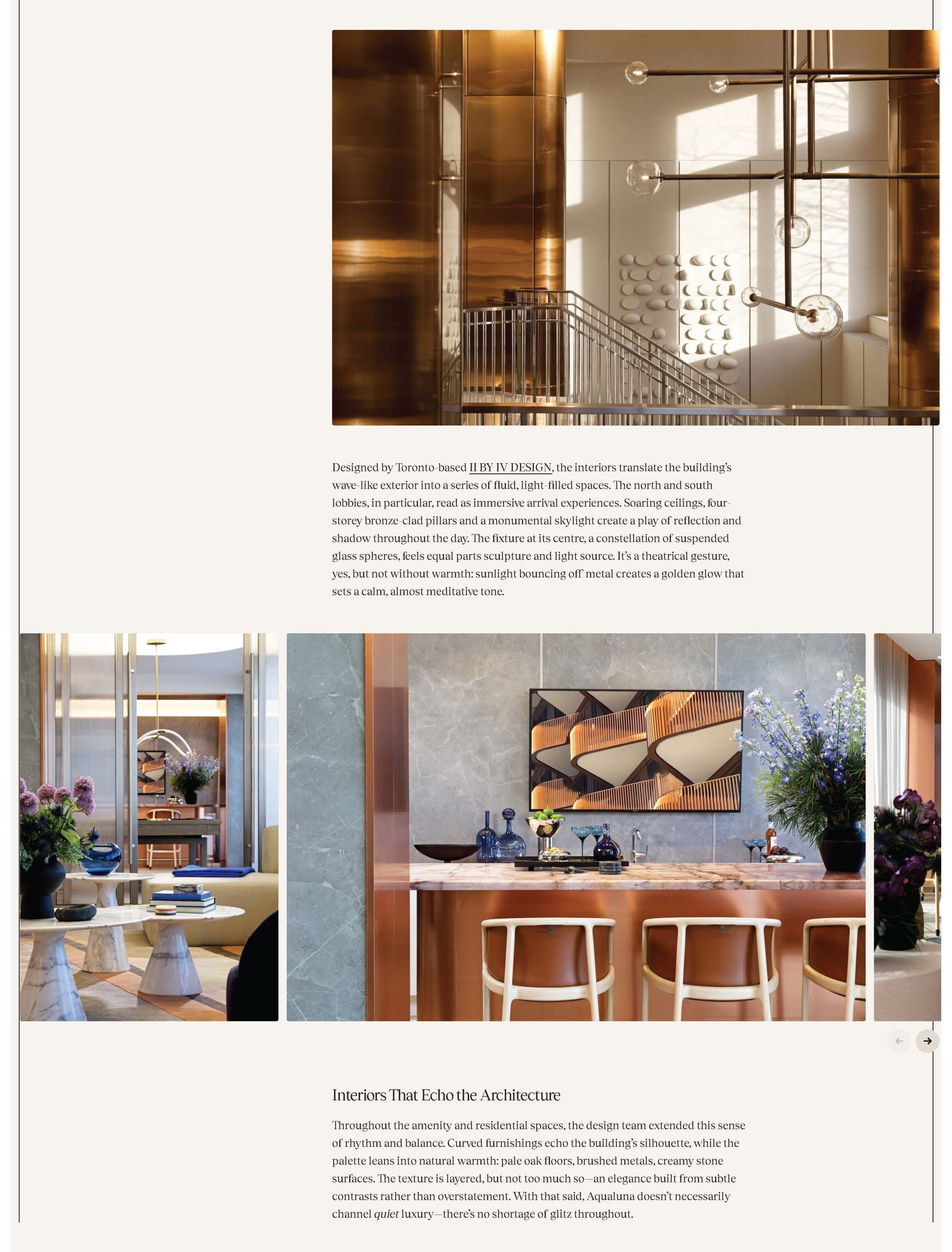 September 2025 – The Designlines article “A Peek Inside Aqualuna” describes how the Aqualuna Toronto residences transform their rippling, copper-toned exterior into interiors that echo their sculptural façade, using flowing forms, warm natural materials, dramatic lobby spaces with bronze pillars and monumental skylights.