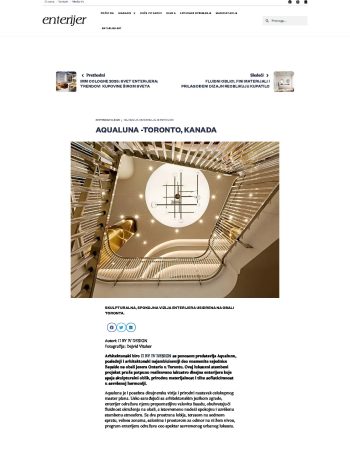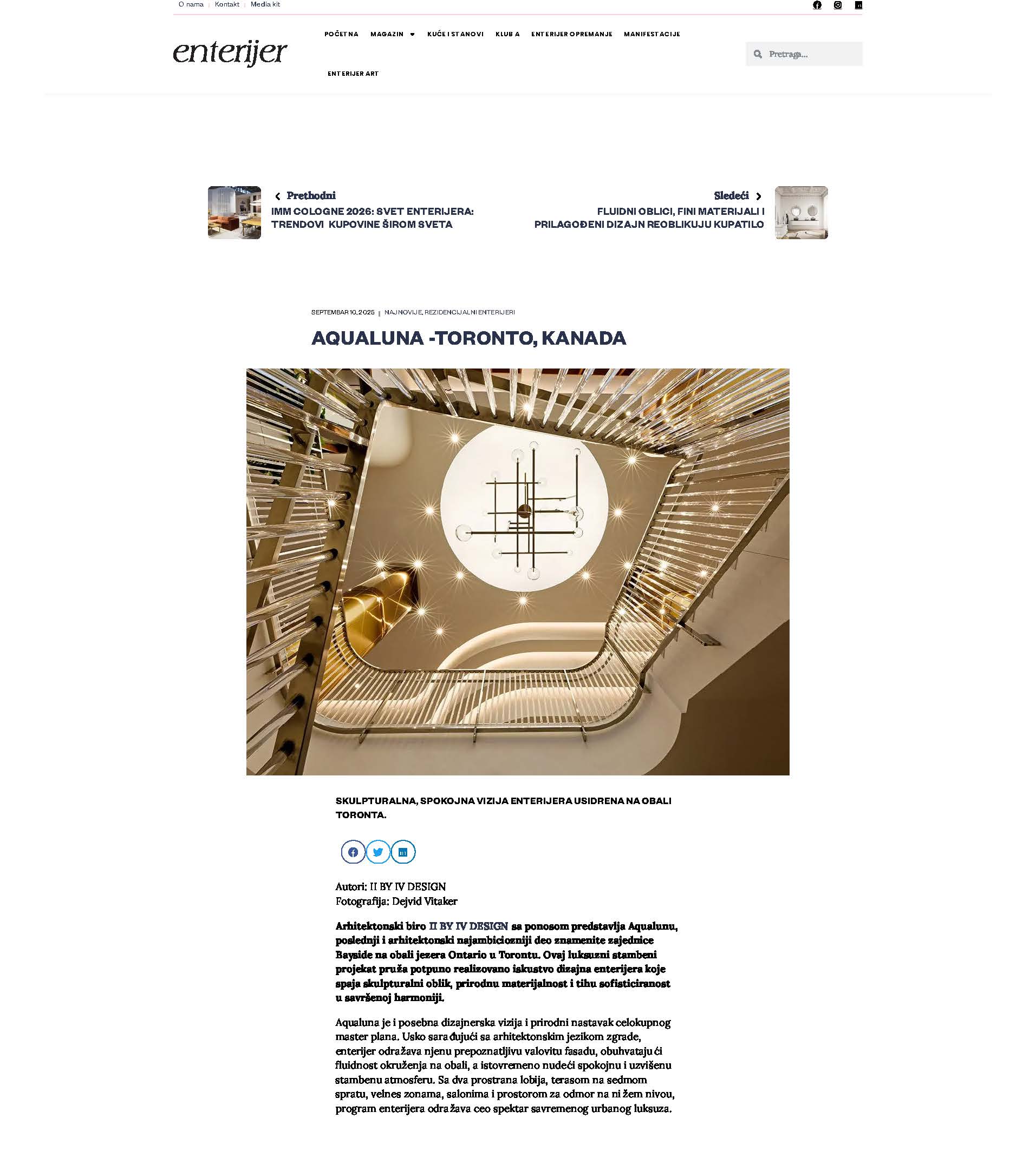 The article “Aqualuna – Toronto, Kanada” in Enterijer Magazin presents a sculptural and serene residential interior design vision anchored on Toronto’s waterfront. Enterijer Magazine is a quarterly high-class Serbian publication focused on architecture, interior design, luxury lifestyle, and showcasing both domestic and international architectural projects, aiming its content at readers who appreciate authentic design and high-end living.